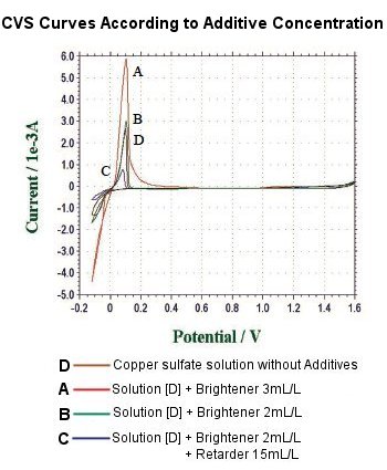 In CVS, quantity of Coulomb is proportional to the quantity of copper which separates out at the working electrode. Especially the quantity of the coulomb at the peak of copper removing means effective activity of the additive, rather than concentration level.