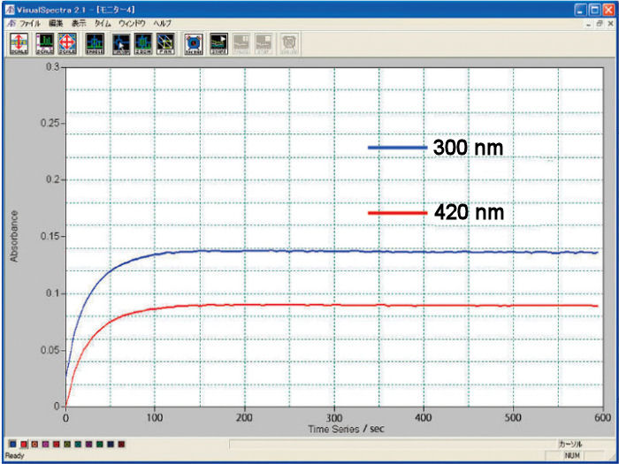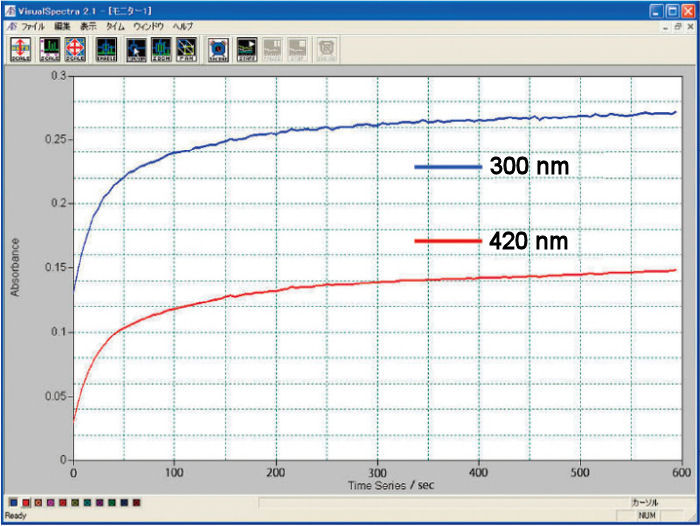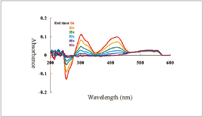 | Fig.3-1. Absorbance changes for the reduction of the potassium ferrocyanide. | Fig.3-2. Absorbance changes for the oxidation of the potassium ferricyanide. |