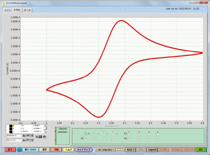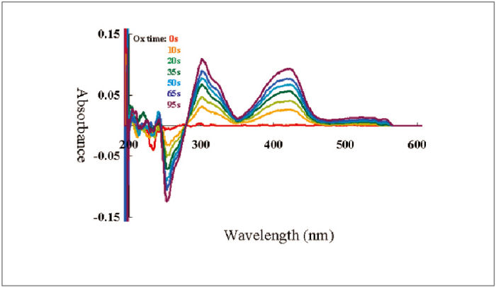 UV-visible absorption spectrum and absorbance of the product of the electrode reaction, performed with optically transparent electrode (OTE), were measured. Gold or Platinum mesh electrode was used as an OTE. Cyclic voltammetry and Absorbance of the 2 mM potassium ferricyanide, as the reference of the absorbance, performed in a SEC-C Thin Layer Quartz Glass Spectroelectrochemical cell are shown below (Figure 2-1, 2-2).