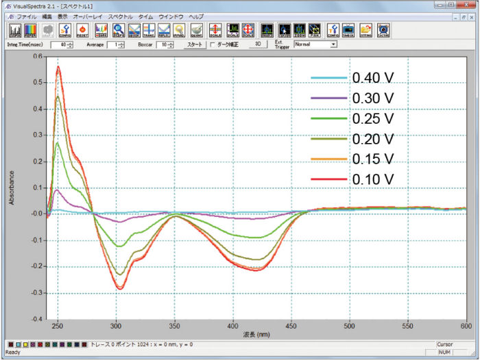 | Fig.2-1. Cyclic voltammetry for 2 mM potassium ferricyanide. | Fig.2-2. Absorption spectra of the electrolytic balance for 2 mM potassium ferricyanide electrolyzed at different potential. |