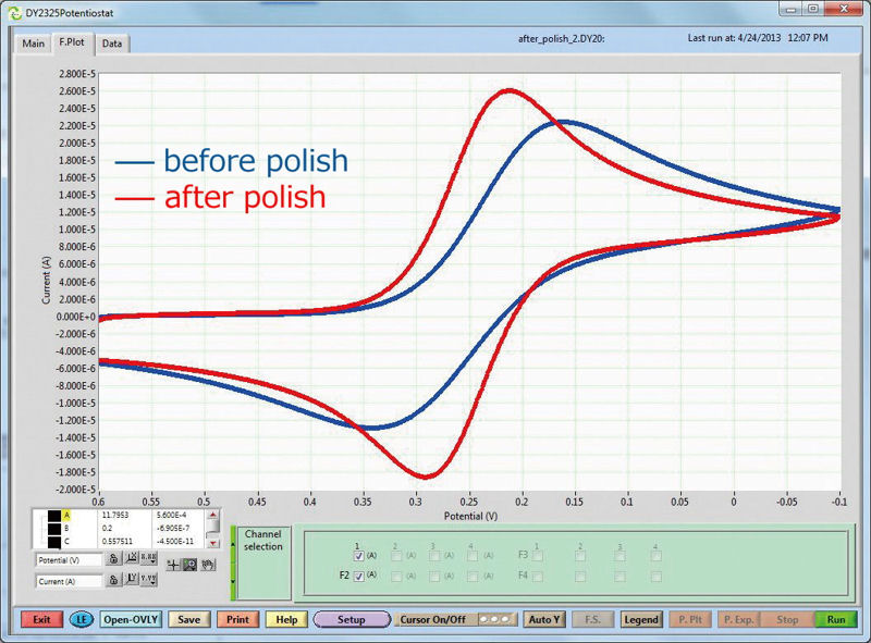 | With repeated electrochemical redox reaction experiments, the adhesion of the experimental products on to the electrode surface, and the electron transfer rate is attenuated gradually. If the electron transfer speed becomes slow, the difference between peak potentials for oxidation and reduction will broaden. | Refreshing the electrode surface by polishing, the electron transfer rate will increase again. Consequently, the peak potential difference becomes narrow and returns to an ideal CV. Electrode: Glassy carbon electrode |