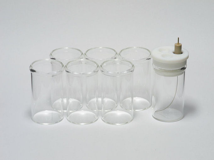- SVC-3 Voltammetry cells consist of four kinds of product: Platinum counter electrode, Sample vials (7 pcs), Teflon cap and Gas purging tube.