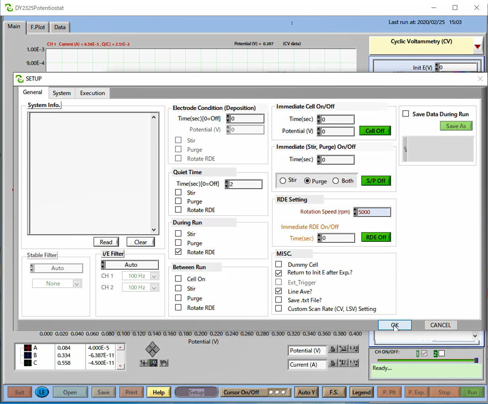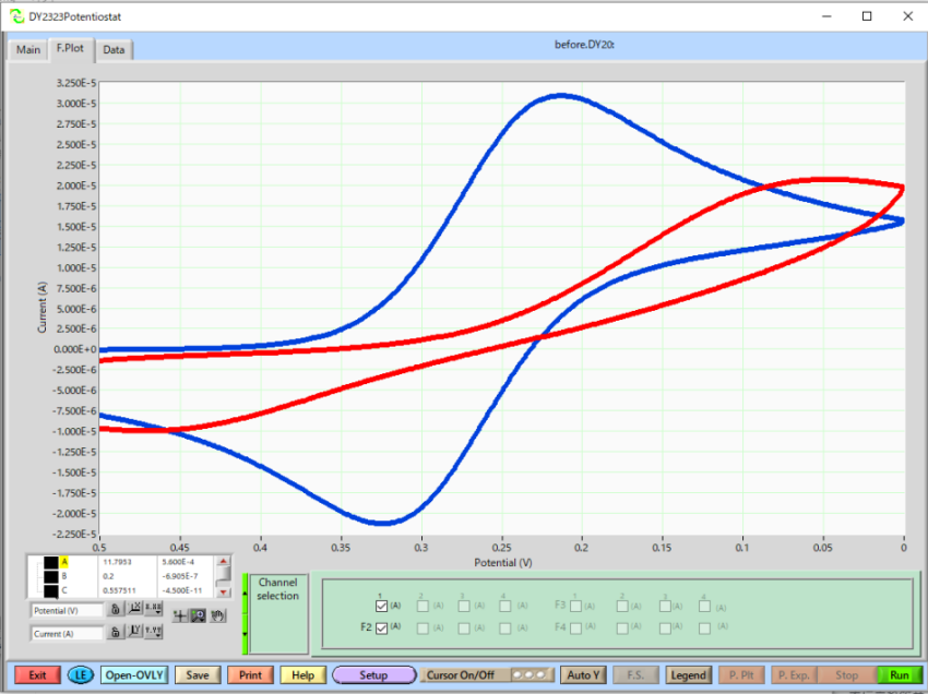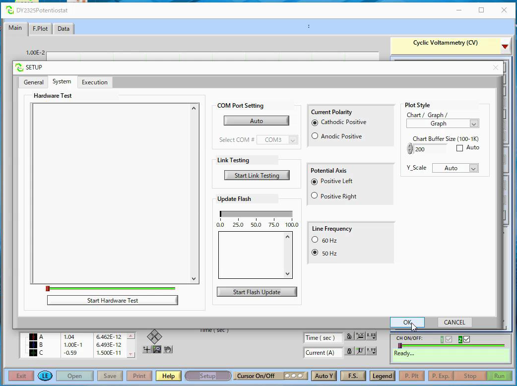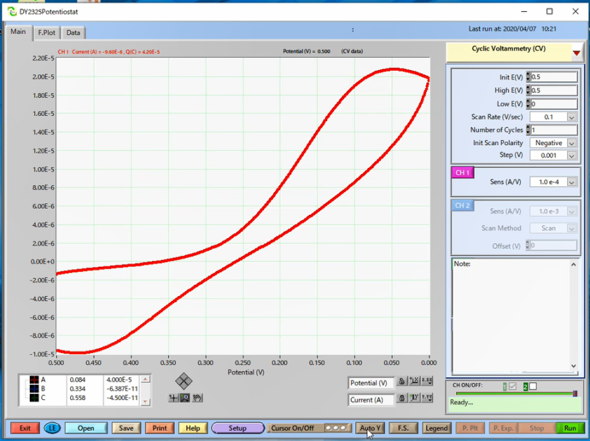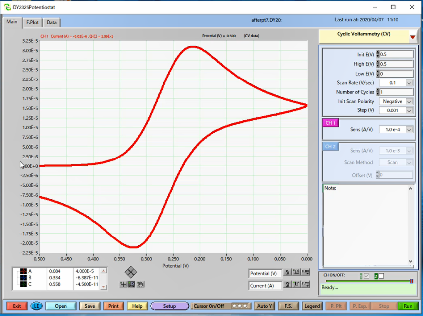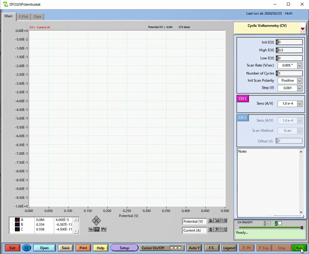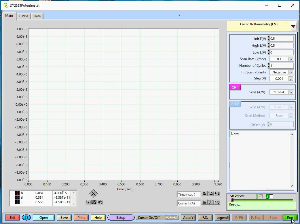 It is ready for the cyclic voltammetry measurement. Press Run to start the scan.