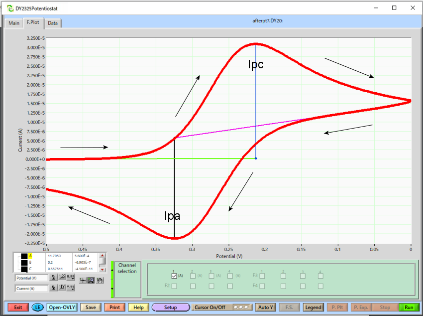 Also, for the data analysis using the Model 2325 Bi-Potentiostat software, it is possible to calculate the diffusion coefficient by the slope of the peak current vs square root of the scan rate plot.