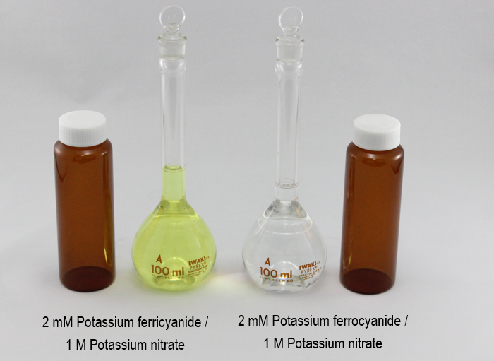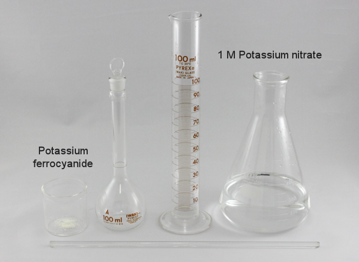 - The solution 1 M Potassium nitrate (Fig. 3) is ready to be used for the preparation of 2 mM Potassium ferrocyanide (K4[Fe(CN)6]) and 2 mM Potassium ferrycyanide (K3[Fe(CN)6]), both in 1 M Potassium nitrate (KNO3).
