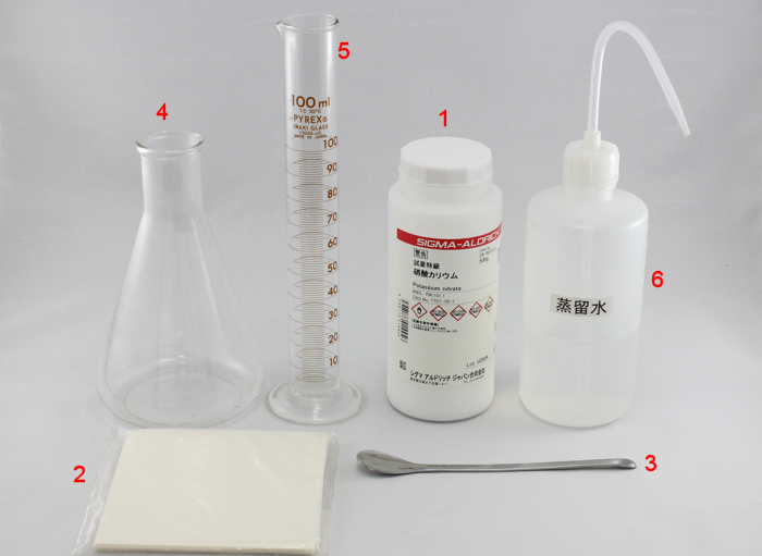 Fig. 3 Transfer the potassium nitrate in to the Beaker 500 mL (4), and dissolve with 250 mL of distilled water (6). Measure the volume of distilled water (6) using a metric cylinder (5).