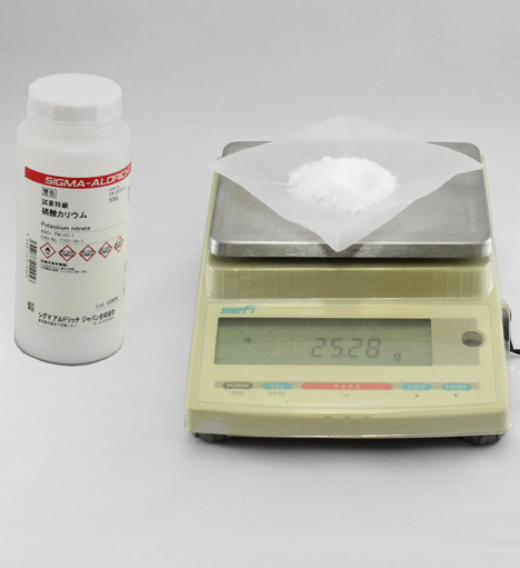 - Measure the 25.28 g (Fig. 2) of the potassium nitrate (1) using the weighing paper (2). Before set the weight paper (2) in an electronic balance, fold and crease the weighing paper (2). It will prevent that when you add the potassium nitrate (1) using a spatula (3), it spreads on the tray.