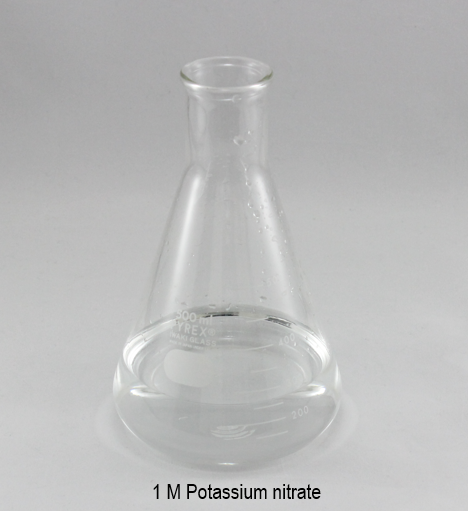 - Add small quantity of 1 M potassium nitrate solution in the beaker and dissolve the salt mixing with a glass rod.