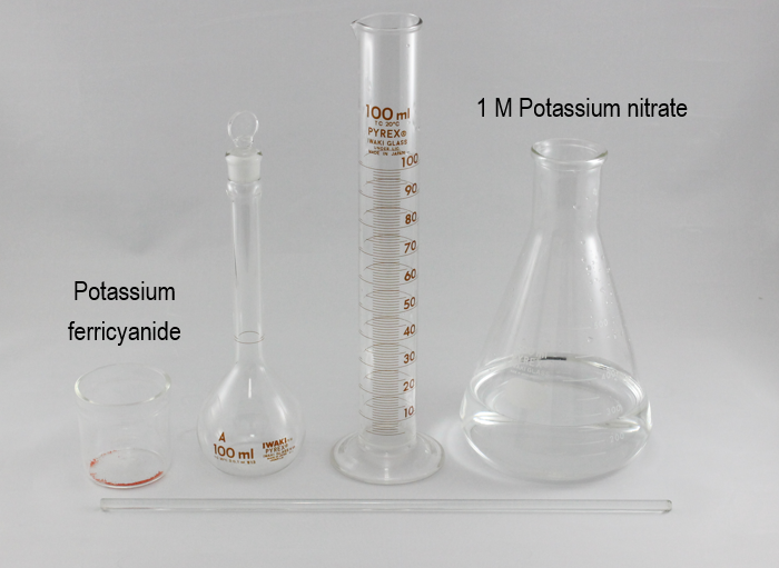 Fig. 6-1 To dissolve the potassium ferricyanide, use the 1 M Potassium nitrate solution prepared in the previous section. The metric cylinder is not required, it was used to know an approximately volume and to prevent the spilling.