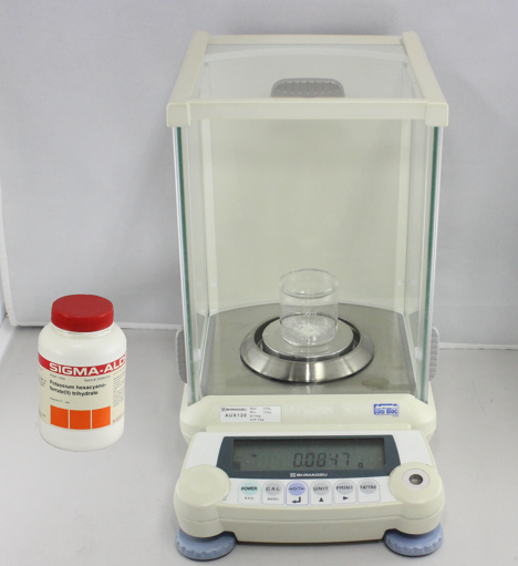 - Measure the 0.0658 g of the potassium ferricyanide and 0.0844 g of the potassium ferrocyanide directly in the beaker 50 mL, using an analytical digital balance (Fig. 5-1 and 5-2).