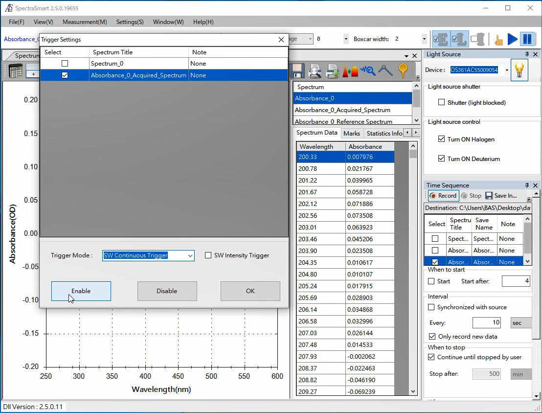 Pressing Run, starts the output signal, and the SEC2020 Spectrometer system receives the signal, starting the measurement.
