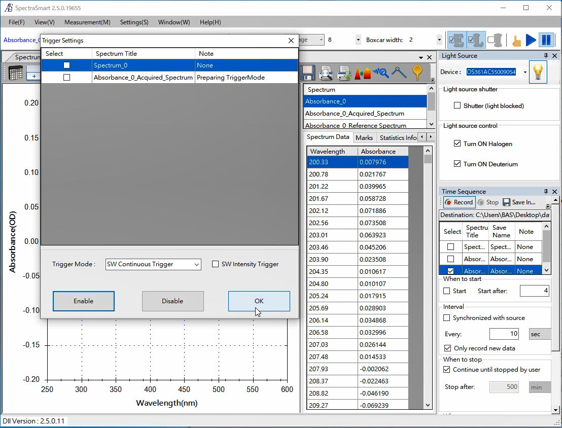 Note: The SEC2020 Spectrometer does not stop the measurement, and for the record of the measurement data, you need to set the saving way according to the technique you will choose.