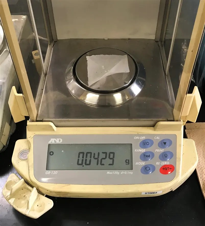 Fig. 4 Weigh 0.043 g silver(I) nitrate (AgNO3) using an analytical digital balance and medicine wrapping paper. After weighing, transfer AgNO3 from the medicine wrapping paper to another 50 mL beaker and add a small amount of the 0.1 mol/L TBAP/ACN solution prepared earlier to dissolve the AgNO3.