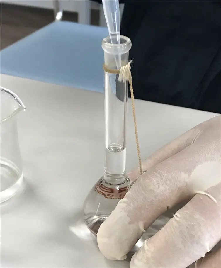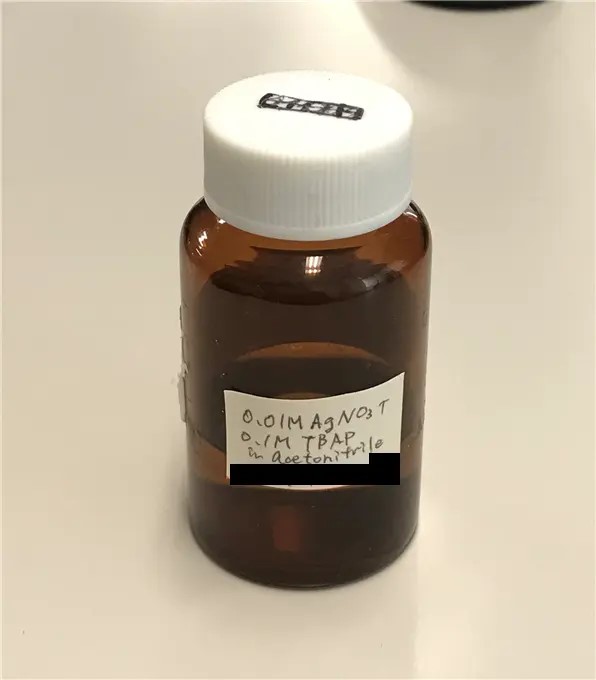 Fig. 6 Transfer the 0.01 mol/L AgNO3/0.1 mol/L TBAP/ACN solution prepared in the previous section from a 25 mL volumetric flask to a light-shielded glass bottle for storage. The approximate storage time is about 1 month in a cool, dark place. Attach a label stating the composition and date of preparation or a toxicology-related label to the light-shielded glass bottle before storing.