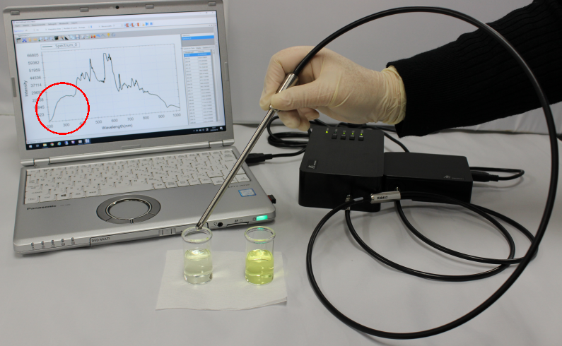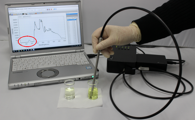 The transmission dip probe consists of two 300 µm fibers, one is for light irradiation and the other is for detector (spectrometer).