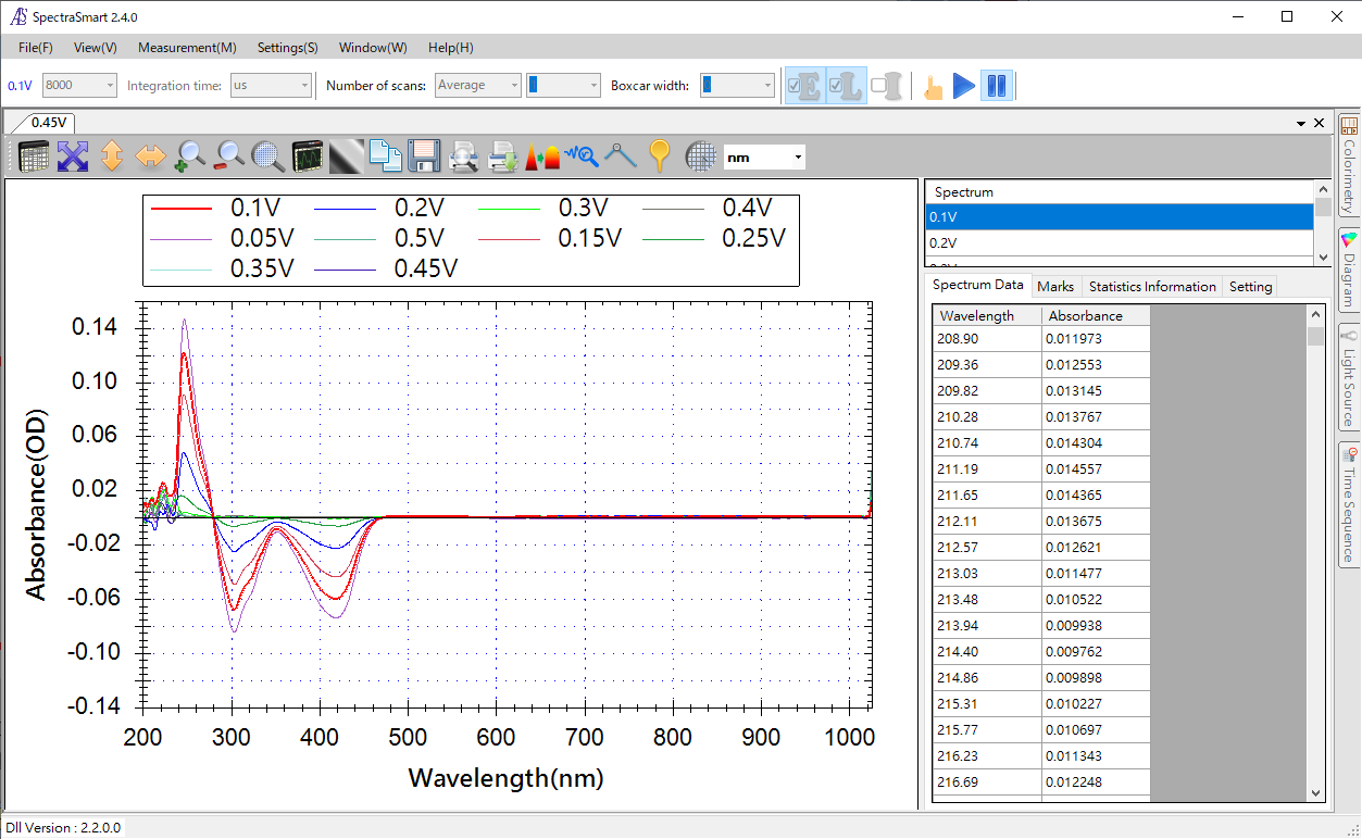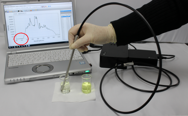 SEC2020 Spectrometer system with a transmission dip probe was used only to show the rapid response of the spectrum change according to the immersion to the measured solution.