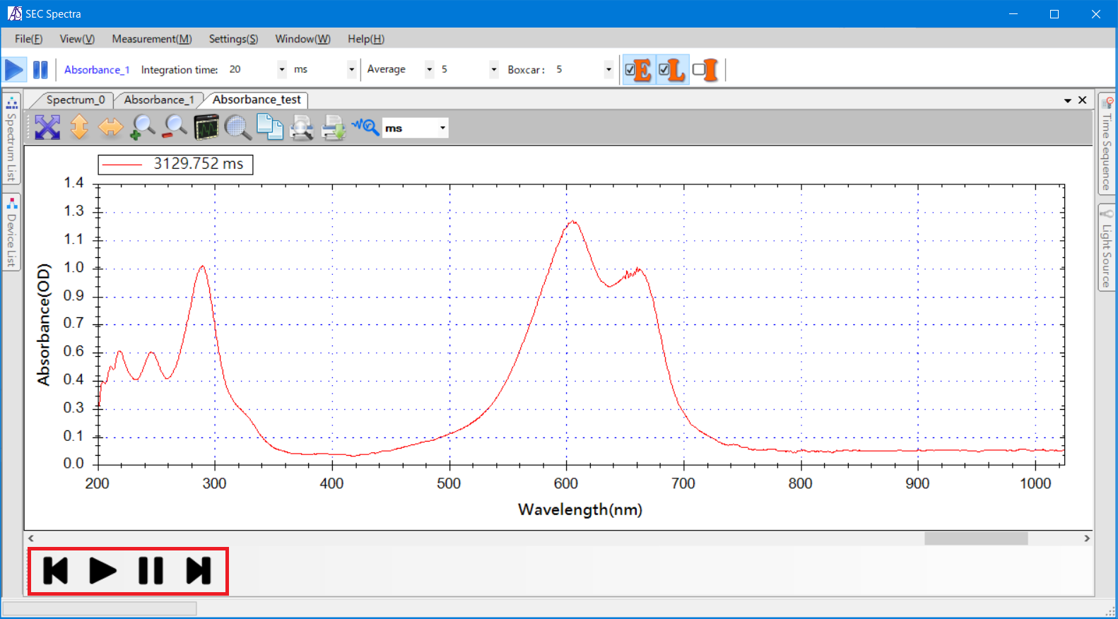 The time sequence file saved in Create file at every tracking interval can be opened, SEC Spectra will display the playback tools for the time sequence file. As shown in the left figure, there are icons that allows the user to Fast-rewind, Play, Pause, and Fast-forward the playback of time sequence. The open file will keep playing over and over again once it is loaded until Pause button is pressed.