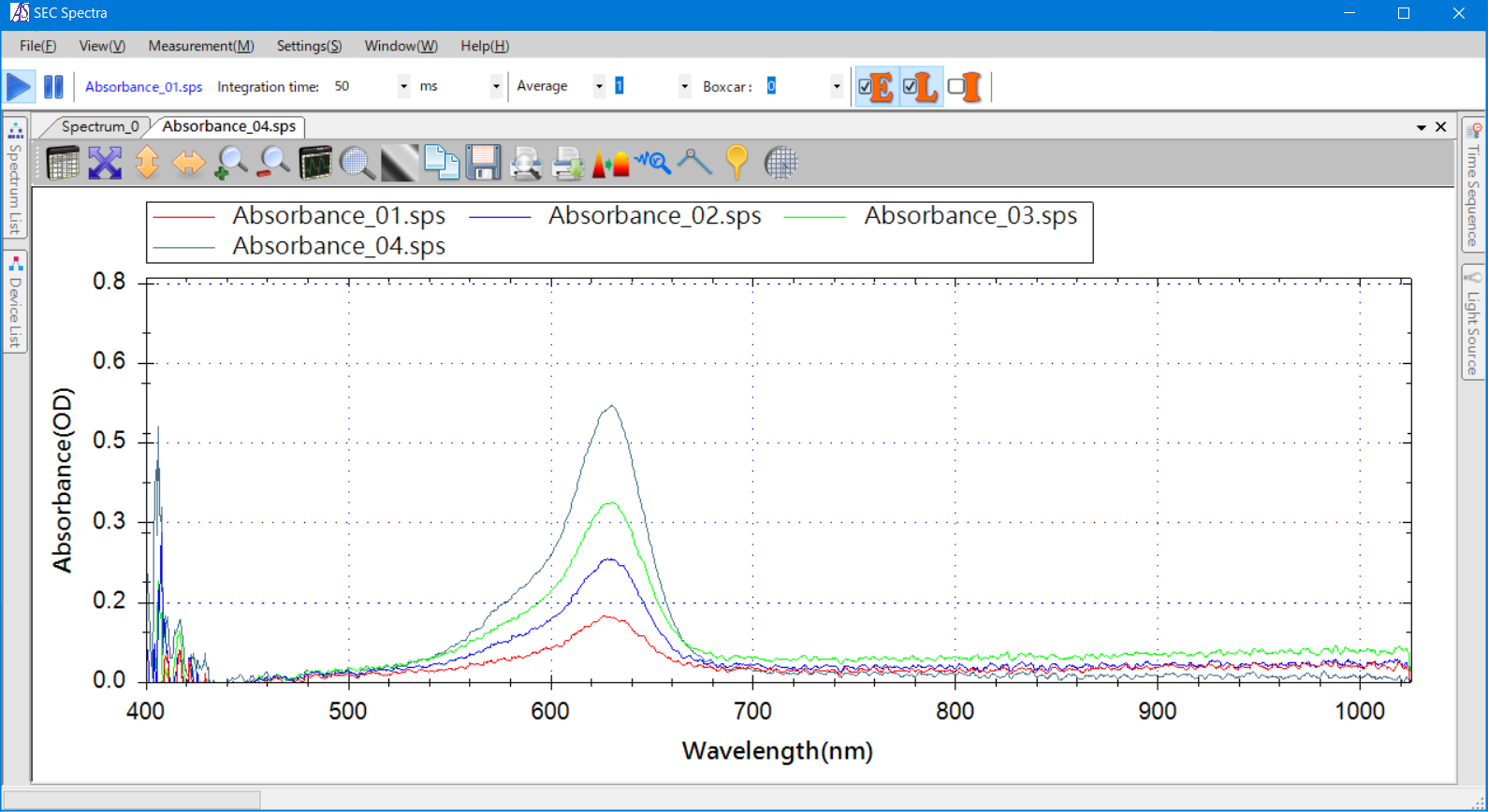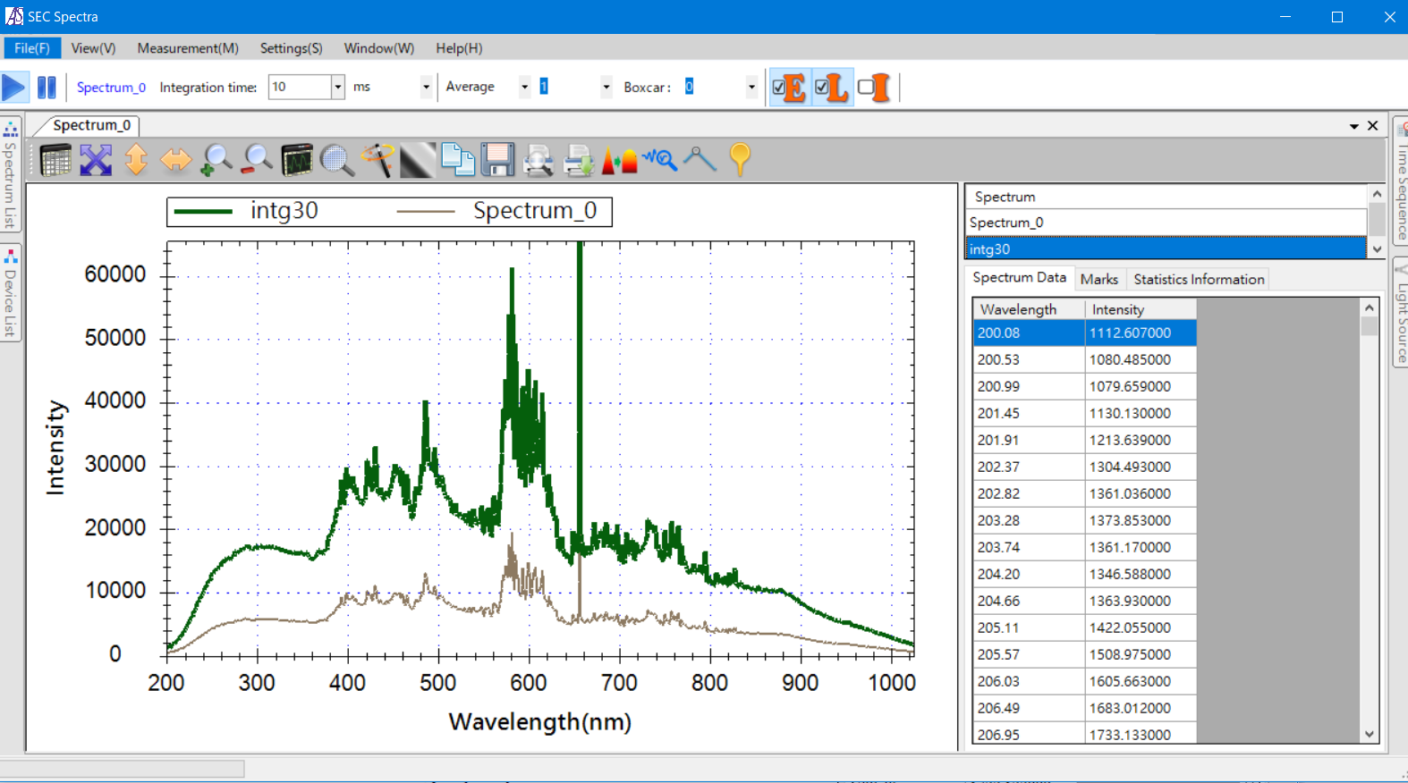 In addition to saving the spectrum as a file, SEC Spectra allows to save the spectrum curve being measured as a temporary log. The temporary log are displayed on the graph being measured, so if you change the integration time of the original Spectrum curve, the difference between the integration time of the two curves can be observed.